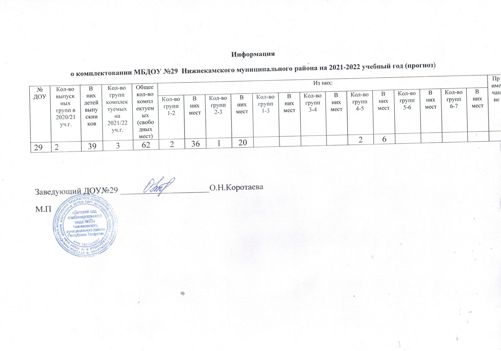 Информация о комплектовании МБДОУ №29 НМР РТна 2020-2021 учебный год