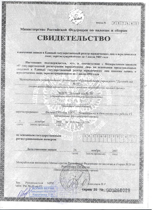 Свидетльство о внсении записи в Единый государственный реестр.