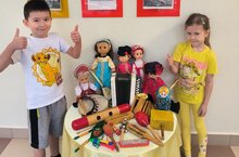 В детском саду проходит выставка «Народной русской культуры», на которой представлены образцы дымковской игрушки, музыкальных инструментов, нарядов и т.д. Дети с восхищением рассматривают изделия народного творчества.