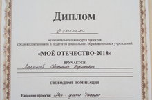 Сотрудники ДОО приняли участие в муниципальном конкурсе «Моё Отечество-2018». На конкурс было представлено два проекта. По итогам конкурса авторы проекта С.Б. Лапина, Ф.С. Ахметова, А.Р. Хусаенова получили Диплом 3 степени; Басырова Т.Н., Гарипова Э.А. – Диплом 3 степени; Прокофьева С.Р. - Диплом 3 степени.