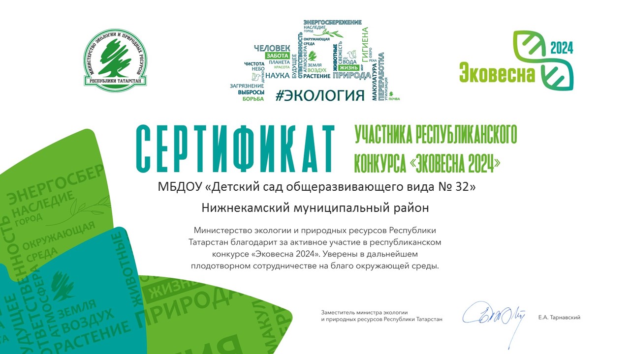 Опубликовано: 17.06.2024В Татарстане завершился экологический конкурс «ЭКОВЕСНА», в рамках которого проведено множество мероприятий, направленных на охрану окружающей среды. Конкурс продолжался восемь недель, каждая из которых была посвящена отдельной теме. Сертификат участника республиканского конкурса «ЭКОВЕСНА 2024» получил и наш детский сад.