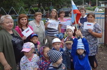 Дети раздавали жител\м микрорайона рисунки и поделки с флагом России. Поздравляли жителей с раздником. Спрашивали, что означают цвета российского триколора. Кто не знал, учили.