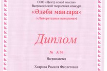 Воспитатель нашего детского сада Хаярова Рамиля Феолетовна принимала участие во Всероссийском конкурсе "Әдеби манзара" и вот долгожданный диплом. Поздравляем! Желаем дальнейших успехов!