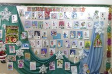 В преддверии нового года в детском саду в холле организована выставка-раскрасок нарядных елочек, снегурочек, дедов морозов и снеговиков. Воспитанники средних групп №4,10, старших №5,11,подготовительных к школе групп №6,9 участвовали в двух всероссийских творческих конкурсах- раскрасок «Новогодний хоровд» и «Новогодний снеговик». Родители совместно с детьми проявили фантазию и творчество, чем только не украшены рисунки : рисом , гречкой, бисером, тканью, , блёсками, ватными дисками, и в разной технике пластилином, глиной и красками.
