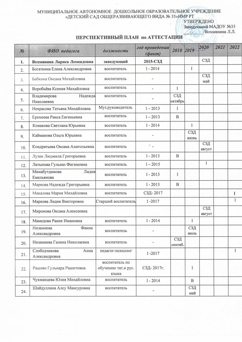 Перспективный план прохождения аттестации педагогическими и руководящими работниками МАДОУ № 35 на 2018 - 2022 годы