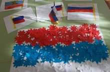 Накануне праздника с детьми проведены беседы, прочитаны книги о символике нашего государства: "Флаг моей страны", "Белый, синий, красный", разучены стихи о Родине, флаге, России. В творческой мастерской воспитанники изготавливали флажки из различных материалов.