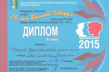 В региональном конкурсе "За лучшую постановку военно-патриотической работы в детских садах и общественных музеях" и "за активную краеведческую и военно-патриотическую творческую деятельность" посвященную 70 летию Победы советского народа над фашистской Герменией и Году Литературы нашему коллективу вручен диплом.