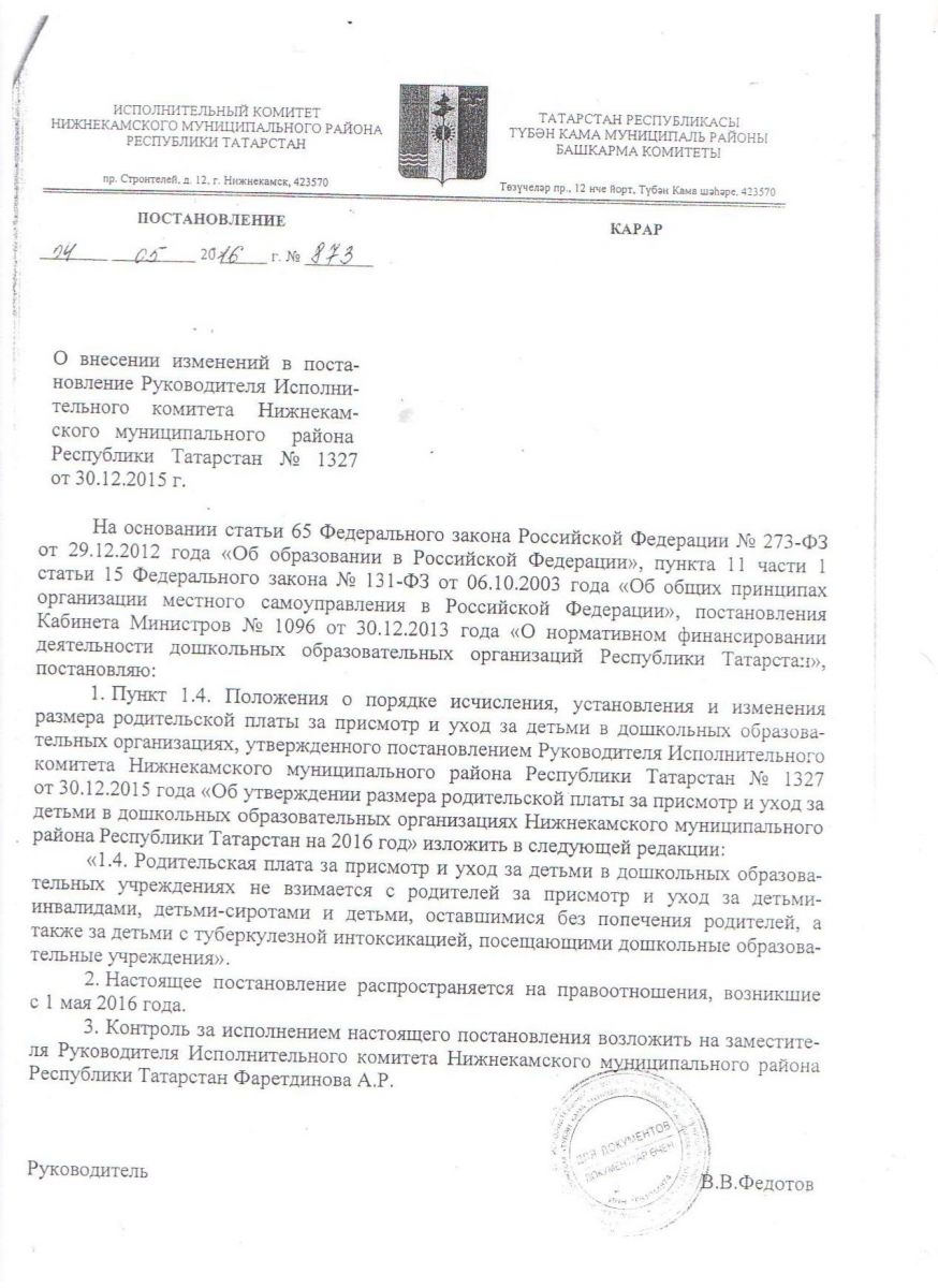 О внесении изменений в Постановление РИК №1327 от 30.12.2015г