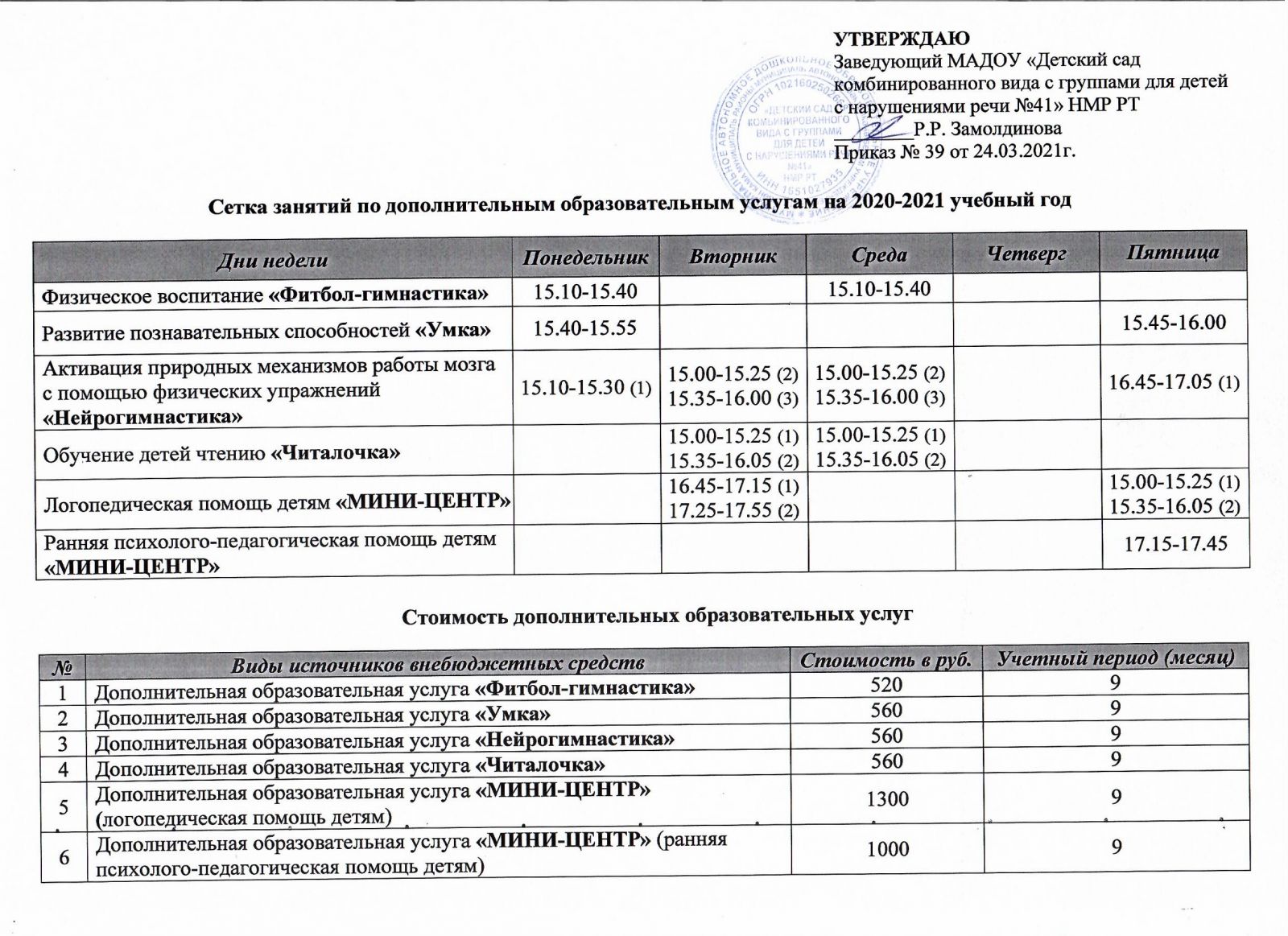Сетка занятий и стоимость платных дополнительных образовательных услуг