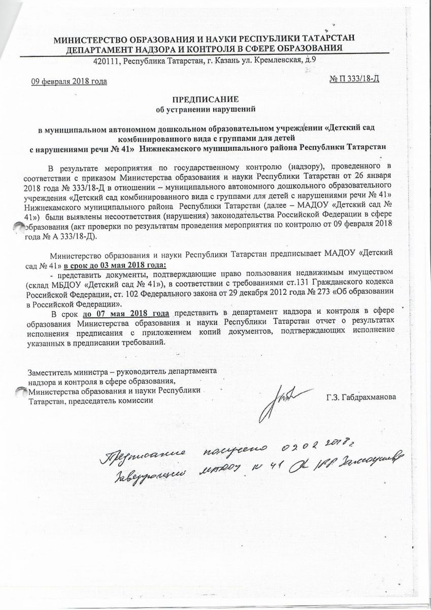 - Предписание Департамента надзора и контроля в сфере образования МОиН РТ 2018г.