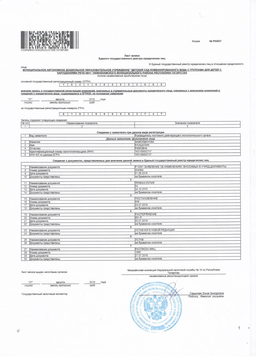 Лист записи ЕГРЮЛ на дополнительное образование детей
