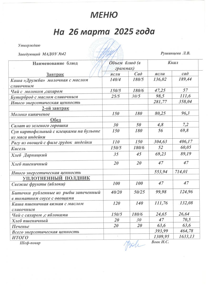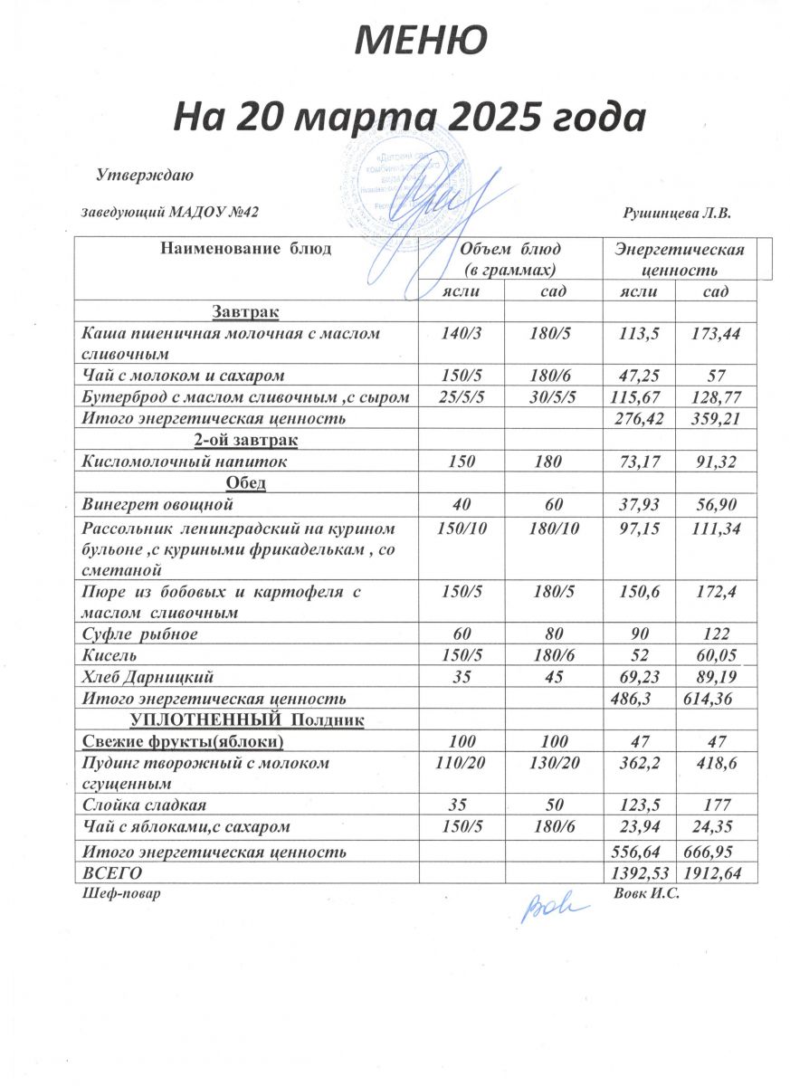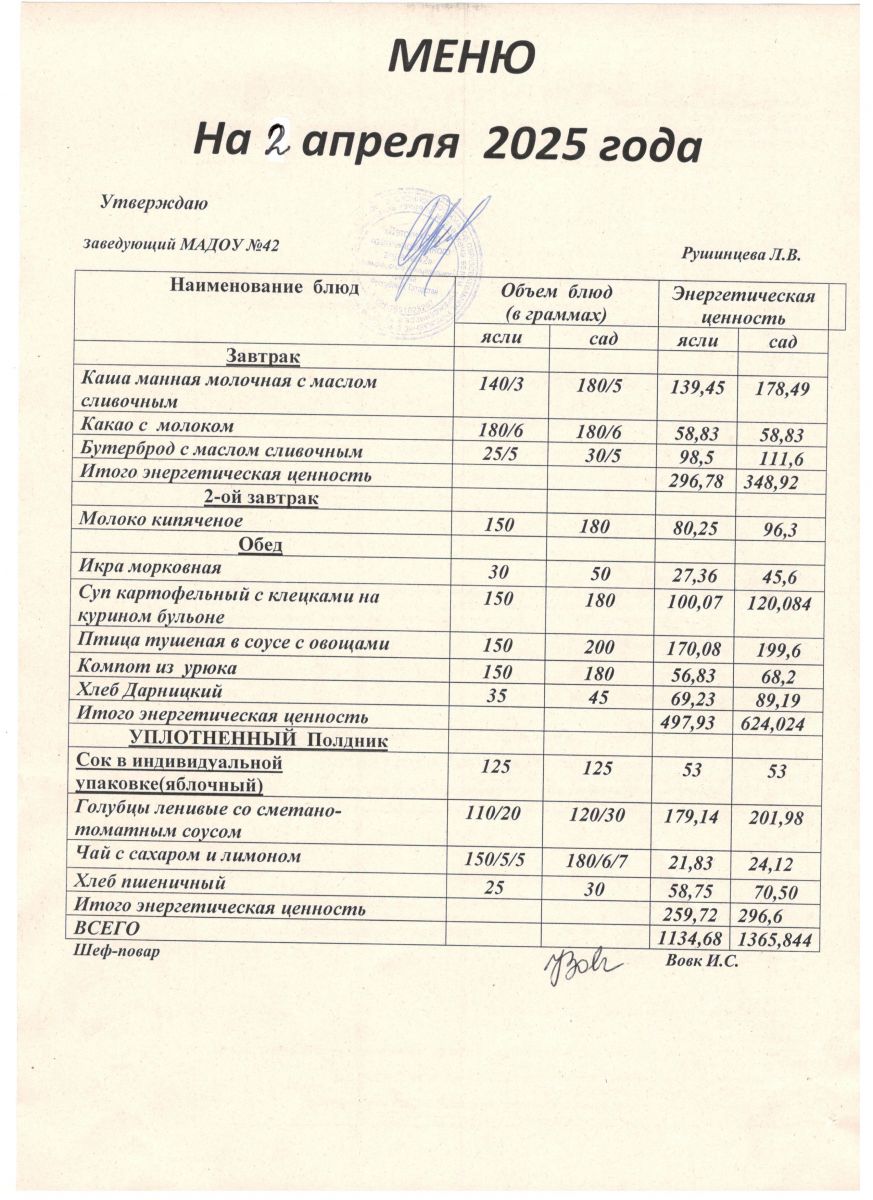 При разработке меню учитывают возрастные группы: 1-3 лет и 3-7 лет. Набор блюд при этом единый, различен объем порций для младших и старших детей. Энергетическая ценность меню просчитано по установленным нормам: для ребенка младше трех лет составляет 1400 ккал, а старше трех лет – 1800 ккал.