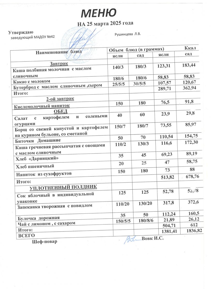 Детский сад работает по утвержденному 10-ти дневному меню с учетом рекомендуемых среднесуточных норм питания. Рацион питания разнообразен как за счет расширения ассортимента продуктов, так и за счет разнообразия блюд, готовящихся из одного продукта.