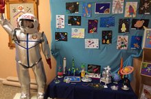 На общегородской неделе Космоса, педагоги нашего сада организовали выставку поделок приуроченных к теме Космоса. А творческая группа собственными силами создали фигуру Юрия Гагарина.