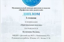Воспитнница нашего детского сада Кузнецова Полина заняла I место в муниципальном конкурсе рисунков и поделок "Профессии моих родителей!"