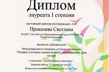 Коллектив детского сада поздравляет воспитанницу группы № 8 Проказову Свету с дипломом лауреата 1 степени на международном конкурсе детского творчества "Подарок маме своими руками" посвященного Дню матери.Подготовила воспитанника воспитатель Васкина А.Н. Желаем дальнейших творческих успехов.