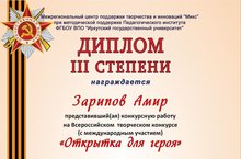 Сегодня воспитанники групп №№ 1,7,8,10,11,12,13 получили дипломы победителей и участников Всероссийского творческого конкурса, посвященного Дню Победы, "Открытка для героя". Поздравляем участников и педагогов, подготовивших к конкурсу: Ахметшину Э.Т., Березкину Л.В., Бобкову С.А., Гинятову С.З., Гилазиеву Ф.М., Давлетшину Г.Н., Ларину Г.И., Ласточкину Е.В., Лохтюкову Л.И., Пинегину Т.А., Улимову Г.Р.