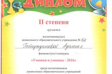 "Зирәкләр һәм тапкырлар" бәйгесе.II тур. 23.03.2016 Безнең бакчадан мәктәпкә әзерлек төркеменнән Гайнутдинова Аделина катнашты. Узенең чыгышын ул әти-әнисе белән берлектә башлап җибәрде. Узе белән таныштыргач ул шәһәребезгә 50 ел тулу уңаеннан җыр да башкарды. Узенен хыяллары белән таныштырды. Логик фикерләү, математик мәсәлә һәм авазларның урынын табуга юнәлдерелгән биремнәрдә дә Аделина сынатмады. Эзләнү эшчәнлеген ул этисе Дамир белән берлектә күрсәтте. Алар усемлекләрнен ничек су эчүләре, тукланулары турында тәҗрибә ясап күрсәтте. Нәтиҗәдә балалар бу бәйрәмнән ләззәт алдылар, шулай ук бүләк һәм диплом алып кайтып киттеләр.