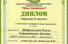 Из нашего детского сада приняли участие воспитанницы группы № 8 -Шафигуллина Раиля Равилевна и Гайнутдинова Аделина Дамировна. Они исполнили песню "Үз җырыбыз булсын әле "( Ф. Галимов көе, Ә.Яруллина сүзләре) и в номинации " Эстрадное пение (ансамбль)" получили диплом Лауреата II степени. Поздравляем и желаем дальнейших творческих успехов! Благодарим музыкальных руководителей- Асхадуллину А.В. и Шайдуллину Ф.Ш. за подготовку детей к конкурсу.