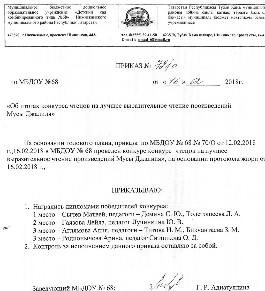 Приказ об итогах конкурса чтецов произведений М. Джалиля