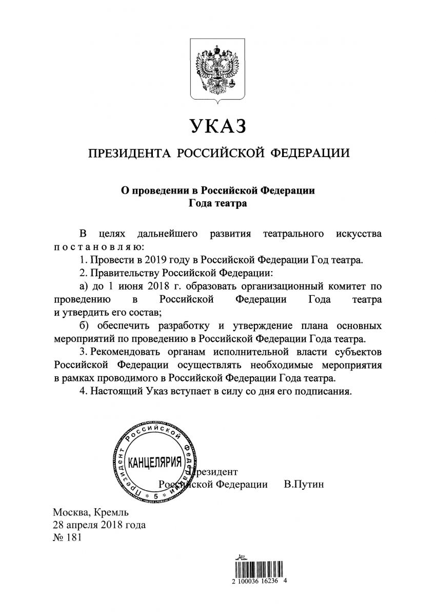 Опубликовано: 09.01.2019В соответствии с Указом Президента Владимира Путина 2019 год в Российской Федерации объявлен Годом театра. Его основные задачи связаны с сохранением и популяризацией лучших отечественных театральных традиций и достижений; доступностью лучших образцов театрального искусства для жителей разных городов, совершенствованием организации театрального дела и привлечением внимания к вопросам театрального образования. Мероприятия Года охватят все регионы Российской Федерации. В рамках Года запланированы масштабные международные и всероссийские мероприятия. С марта по ноябрь 2019 года продлится Всероссийский театральный марафон, который начнется во Владивостоке, охватит всю страну и завершится в Калининграде. С июня по ноябрь в Санкт-Петербурге состоится Театральная олимпиада. В 2019 году пройдет 25-й фестиваль «Золотая маска», XIV Международный театральный фестиваль имени Чехова, открытие сцены Малого театра в городе Когалыме, гастрольные проекты в рамках программы «Большие гастроли», Летний фестиваль губернских театров, Фестиваль театров малых городов России, Фестиваль-конкурс любительских театров России. Также в программе — мероприятия Союза театральных деятелей России, издание «Театральной энциклопедии России», тематические форумы, встречи, мастер-классы, семинары с ведущими актерами, режиссерами и театральными специалистами; круглые столы, посвященные вопросам сохранения уникальных театральных профессий и другим актуальным темам; конкурсы, направленные на поддержку современной драматургии и молодой режиссуры. Оргкомитет по проведению всероссийской программы Года театра в России возглавила заместитель Председателя Правительства РФ Ольга Голодец. В состав оргкомитета вошли представители федеральных и региональных органов исполнительной власти, общероссийской общественной организации «Союз театральных деятелей РФ», руководители крупнейших российских театров. Принято решение о проведении во всех регионах единого дня открытия Года театра — 13 декабря.