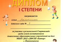 Поздравляем семью Ахметшиных представлявших наш детский сад на Спартакиаде дошкольников 2016 года. Они заняли первое место в составе команды "Улыбка" состоявшей из представителей нескольких детских садов.