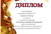 ШАХМАТНЫЙ ТУРНИР 06.04.2016 Сегодня начался шахматный турнир среди воспитанников дошкольных образовательных учреждений НМР. Первый этап прошел на базе ДОУ № 40. Честь нашего детского сада защищал воспитанник подготовительной к школе группы " 5 Гурбанов Назир. Он достойно обыграл соперников и прошел в следующий этап. Мы гордимся нашим воспитанником!