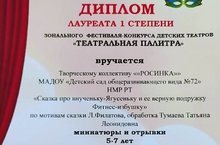 Творческий коллектив нашего детского сада «Росинка» принял участие в зональном фестивале-конкурсе детских талантов «Театральная палитра». Миниатюра «Сказка про внученьку-Ягусеньку и ее верную подружку Фитнес-избушку» была награждена Дипломом Лауреата 1 степени.