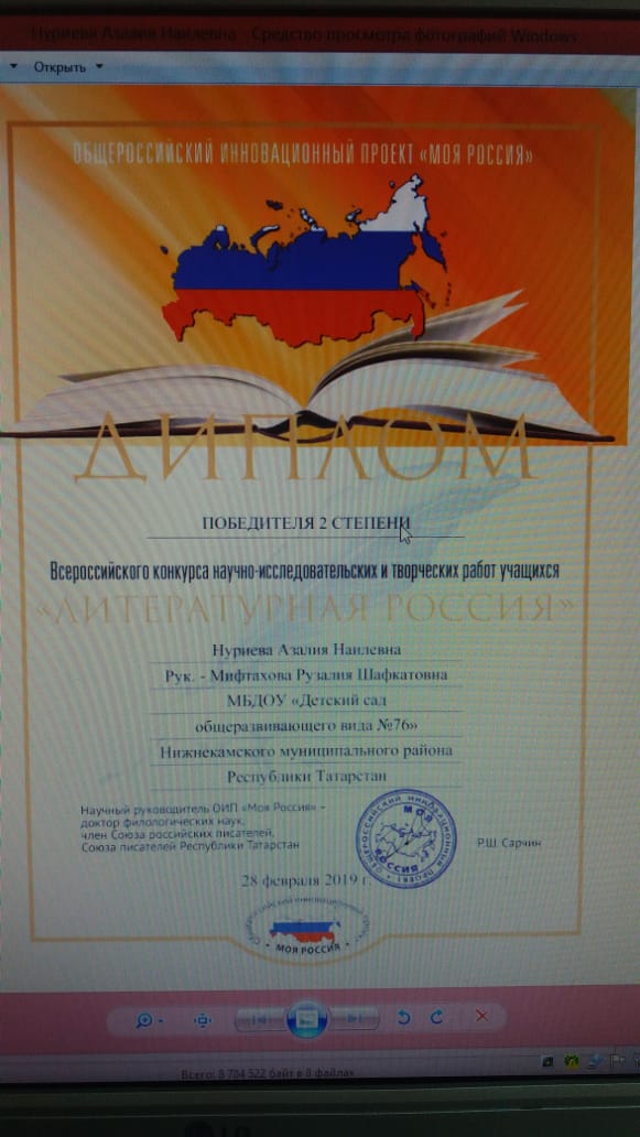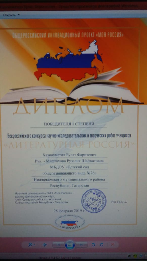 28. 02. 2019 года воспитанники нашего сада приняли участие во Всероссийском конкурсе научно-исследовательских и творческих работ учащихся, и были награждены дипломом победителя I степени- Хазиахметов Булат Фаритович, и Дипломом победителя II степени - Нуриева Азалия Наилевна, Оребердиева Радмила Раджаповна, Амирова Миляуша Ильдаровна. Поздравляем!!! Желаем дальнейших творческих успехов и побед!