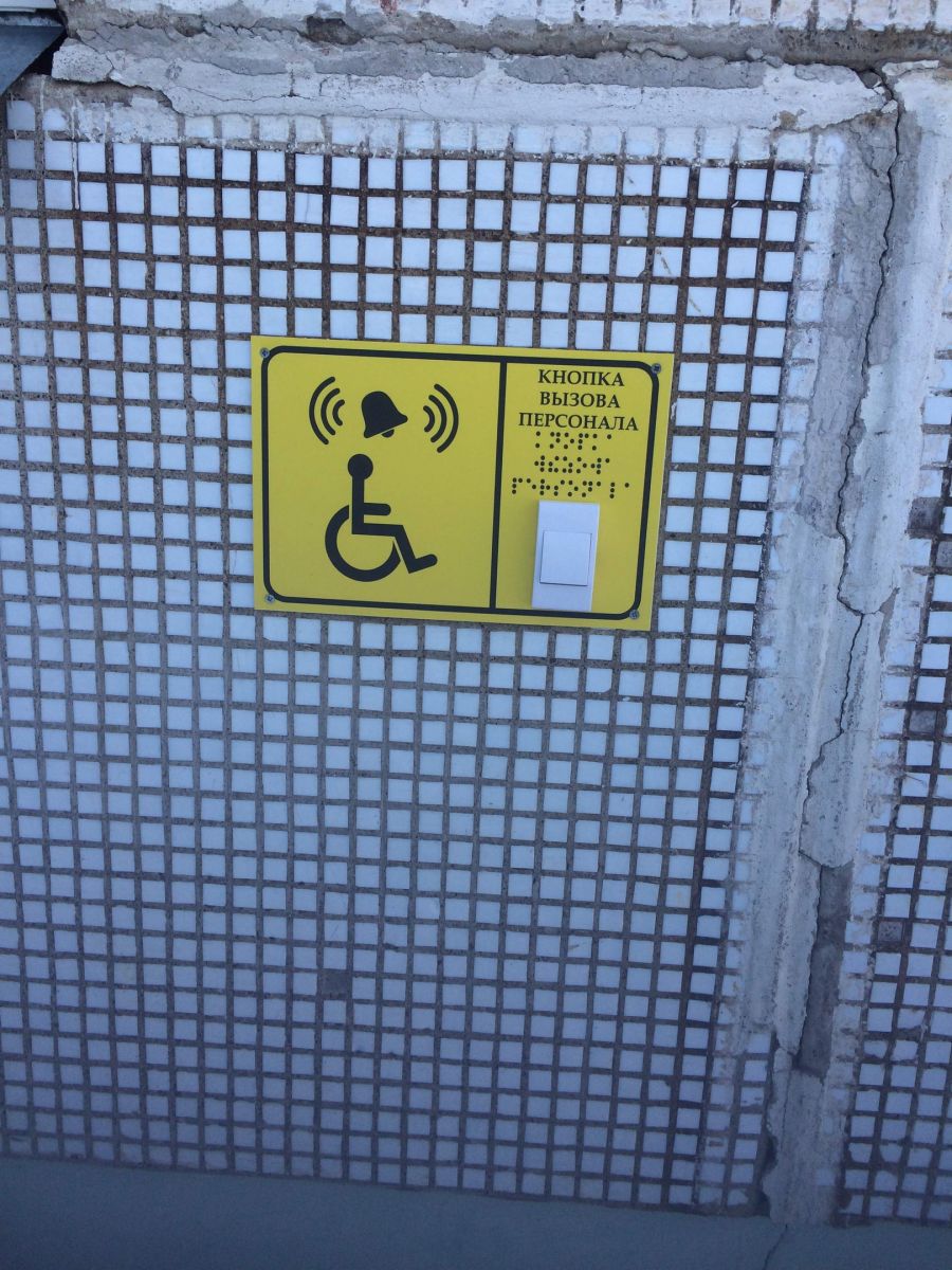 При входе установлена кнопка Кнопка «Вызов персонала».для инвалидов и лиц с ограниченными возможностями здоровья, которая обеспечивает вызов дежурного охранника для оказания помощи при входе в здание и связи с ответственным. На входе так же установлена вывеска со шрифтом Брайля.