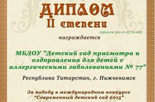 Наш детский сад участвовал в международном конкурсе «Современный детский сад – 2015». И был награжден дипломом II степени в номинации «Современный детский сад – 2015»
