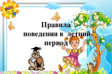 - Не забудьте ознакомиться с рекомендациями по организации досуга ребенка в летний период, оказанию первой медицинской помощи (при укусах, отравлениях, солнечном и тепловом ударах), правилами поведения в лесу, на водоемах, на дорогах и улицах.
