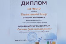 Бүген шәһәребезнең үзәк балалар "Апуш" китапханәсендә "Тылсымлы Тукай әкиятләре дөньясы" рәсем бәйгесе нәтиҗәләре буенча чара үткәрелде. Әлеге рәсем бәйгесендә катнашып, Валиахметова Айгизә (10 нчы төркем), 3 нче дәрәҗә Дипломга ия булды. Котлыйбыз! Уңышлар сиңа, Айгизә. -