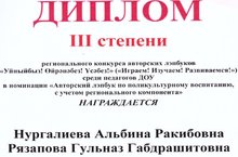 Алабуга шәһәренең 25 нче санлы балалар бакчасында оештырылган "Уйныйбыз! Өйрәнәбез! Үсәбез!" авторлык эшчәнлек бәйгесендә катнашып педагогларыбыз Нургалиева А.Р., Рязапова Г.Г. 3 нче дәрәҗә Дипломга ия булдылар.
