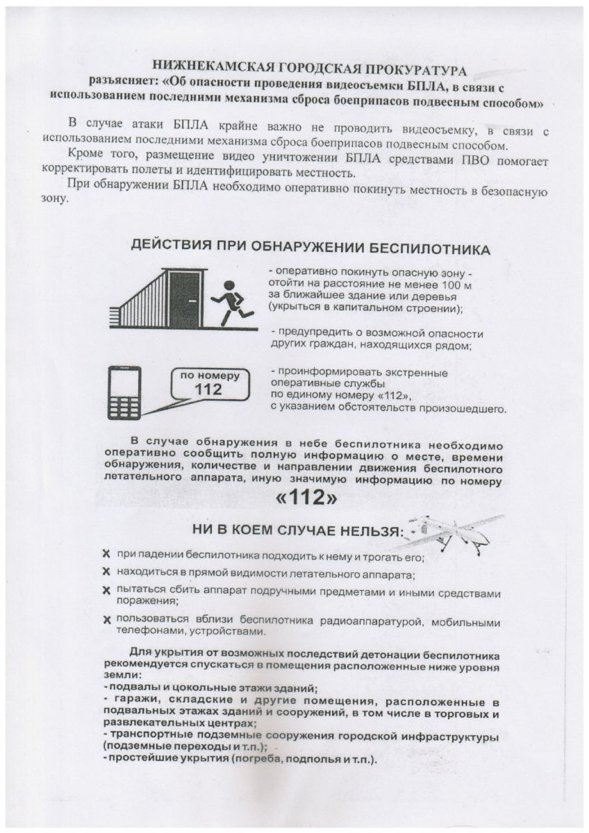 Нижнекамская городская прокуратура разъясняет: "Об опасности проведения видеосъемки БПЛА, в связи с использованием последними механизма сброса боеприпасов подвесным способом".