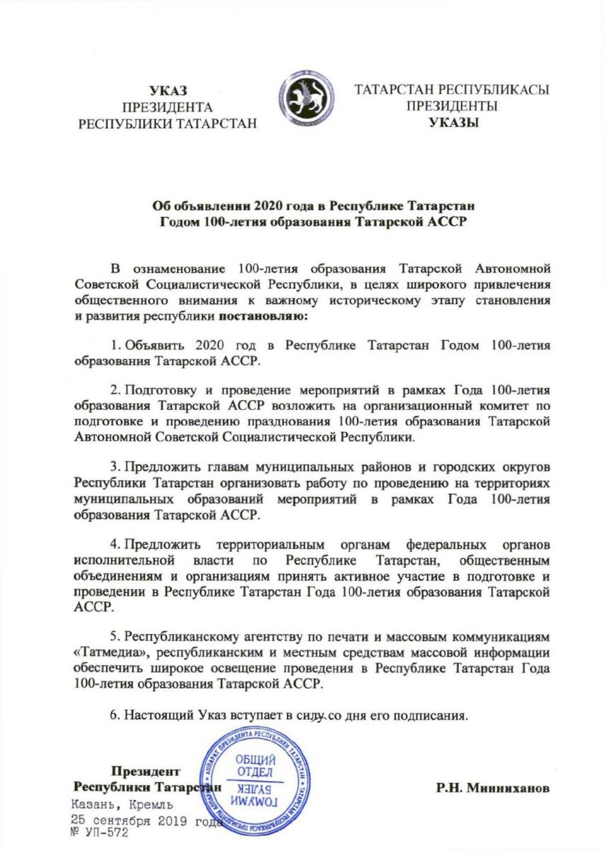 Указ президента РТ об объявлении 2020 года в РТ Годом 100 - летия образования ТАССР
