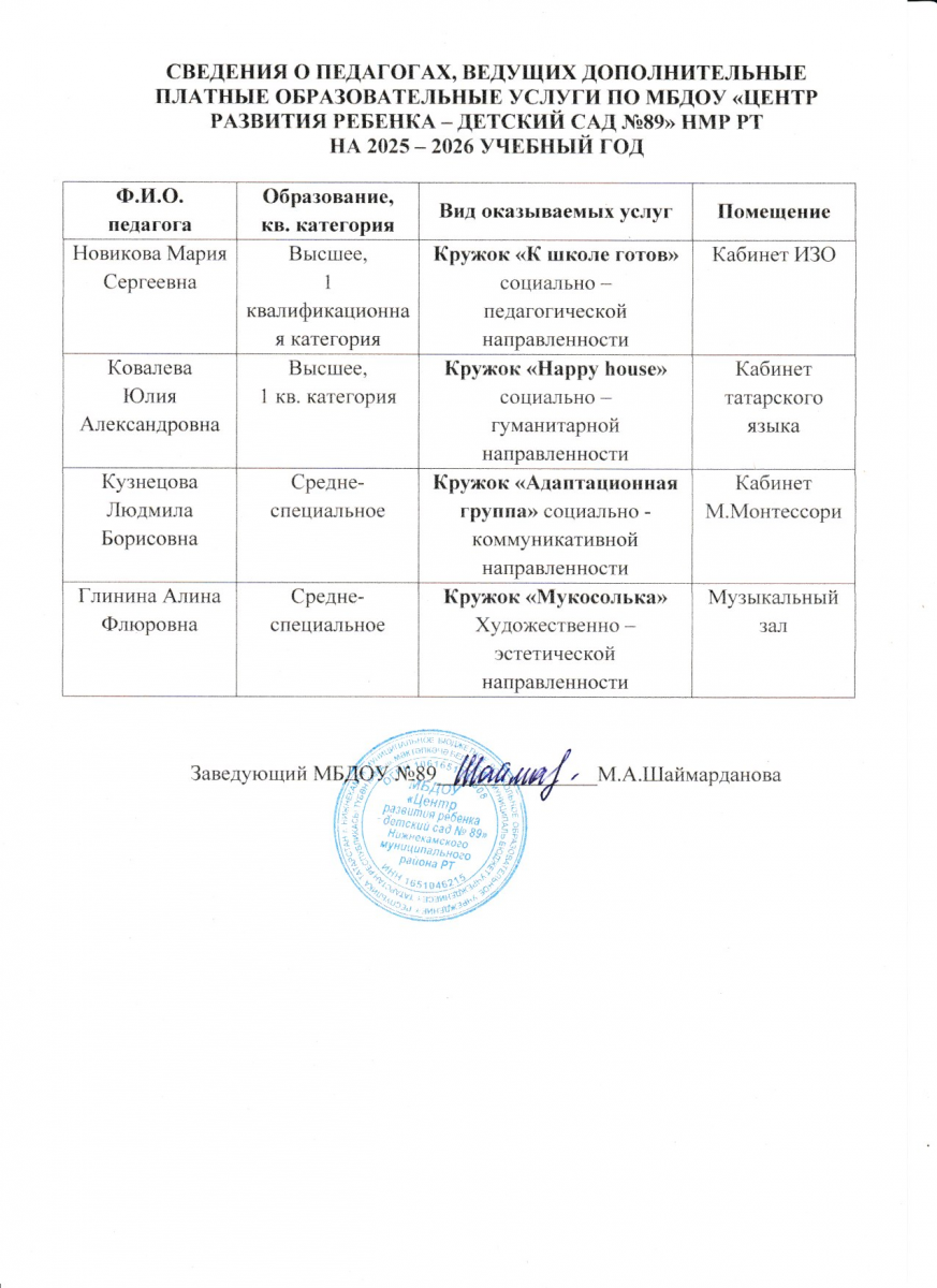 Сведения о педагогах, ведущих платные образовательные услуги 2025-2026 учебный год
