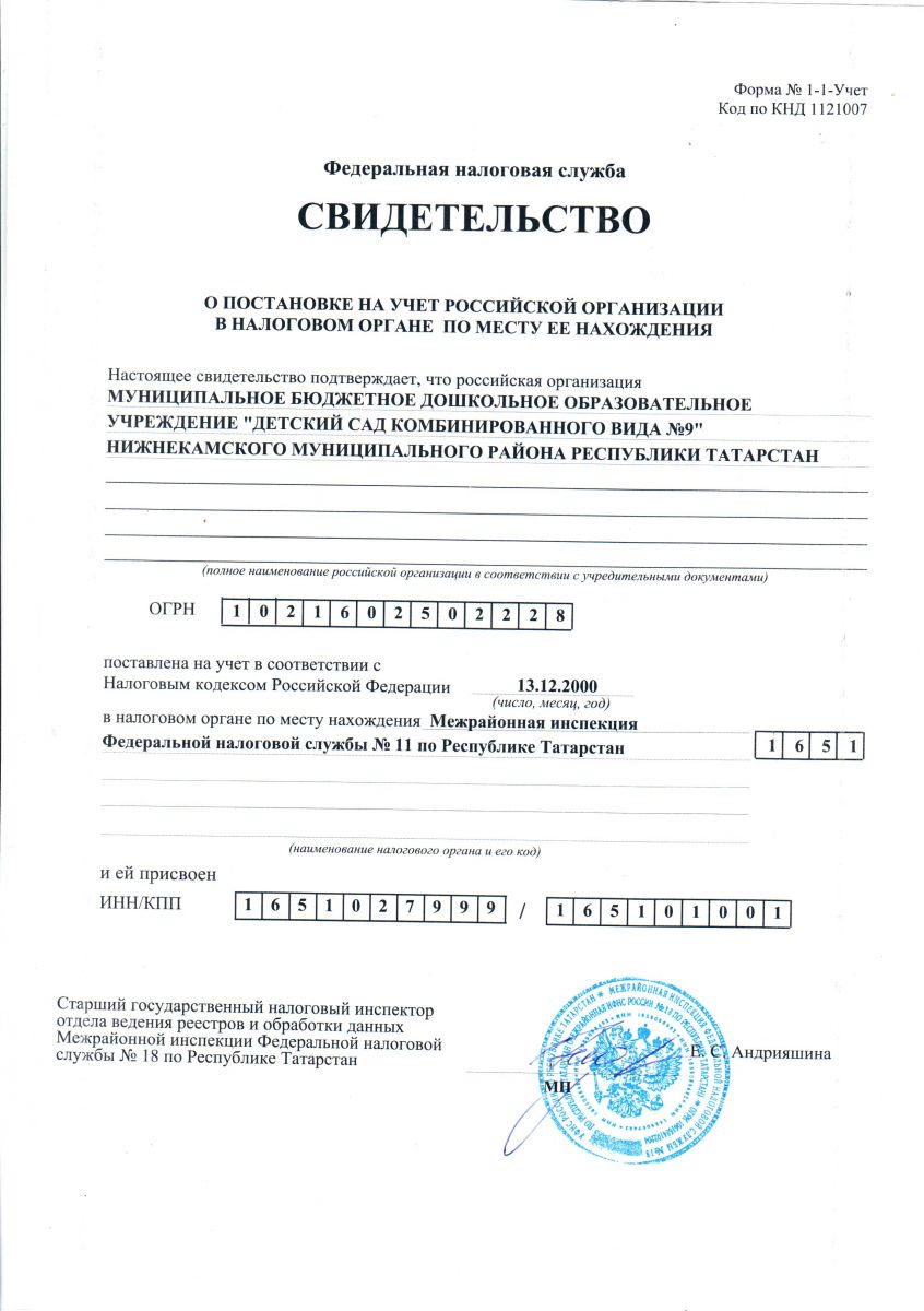 | Короткое название: | МБДОУ " Детский сад комбинированного вида №9" НМР РТ |