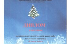 · семейная работа – работа ребенка, сделанная совместно с родителями и (или) другими членами семьи. В этой номинации, приняла участие семья Гайфуллиных, мама Марина Алексеевна и сын Даниил, их елочка была вырезана и оформлена из потолочных плиток. Название работы"Рождественская симфония". Все получили сертификаты участников.