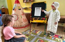 Во всех группах детского сада большое внимание уделяется тренировке зрения, педагоги с ребятами выполняют, гимнастику для глаз сопровождают веселыми стихотворениями. Проводят познавательные беседы, какие продукты нужно кушать для укрепления зрения.Так же играют сюжетно-ролевую игру «Окулист».