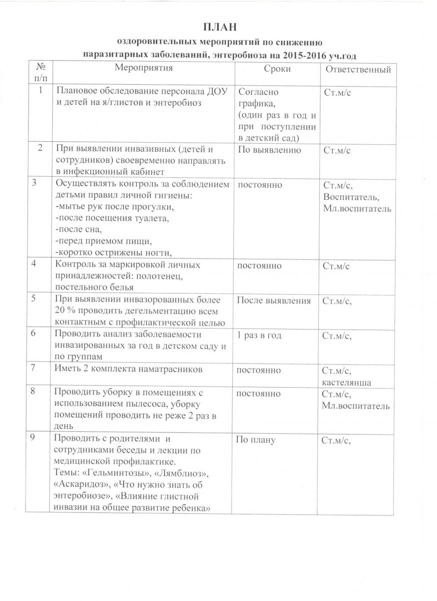 План оздоровительных мероприятий по снижению паразитивных заболеваний, энтеробиоза