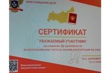 Наши гимназисты прошли Всероссийский тест на знание конституции Российской Федерации 2020, показали отличные результаты и получили сертификаты.