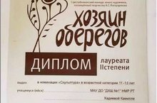 Поздравляем ученицу 8б класса Хадиеву Камиллу, которая стала лауреатом II степени в I Республиканском конкурсе юного художника, посвященного творчеству А. С. Фатхутдинова в номинации «Скульптура». Молодец!