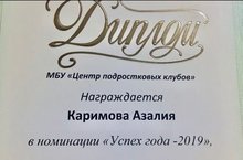 27 февраля в МЦ "КОВЕР"подвели итоги достижений воспитанников Центра подростковых клубов за 2019 год. На торжественной церемонии награждения ученица нашей гимназии Азалия Каримова награждена дипломом в номинации "Успех года - 2019". Желаем дальнейших успехов!
