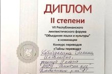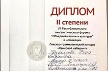 Поздравляем ученицу 9А класса Шумилову Веру, ставшую призёром ( 2 место) VII Республиканского лингвистического форума в номинации «Лексико-грамматический конкурс: «Языковой лабиринт» по французскому языку, проведённого на базе Института международных отношений (КФУ) в городе Казань. Выражаем благодарность учителю французского языка Забировой Розалии Рафкатовне!