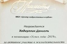 Ученик 7а класса Хадиуллин Даниэль принимает активное участие в деятельности подросткового клуба «Юность», за что был награждён грамотой в номинации «Успех года-2019». Поздравляем!