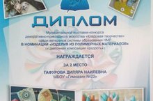 Поздравляем Гафурову Диляру Наилевну, занявшую 2 место в муниципальной выставке-конкурсе декоративно-прикладного искусства "Кладовая творчества" среди Ветеранов системы образования НМР.
