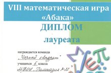 Поздравляем команду "Черный квадрат" (5 Б класс), которая стала лауреатом VIII муниципальной математической игры "Абака". Состав команды: Васильева Оля, Масгутова Алия, Миннегалиев Шамиль и Сабиров Рузэль. Учитель: Пономарева Юлия Валерьевна. Молодцы, ребята!