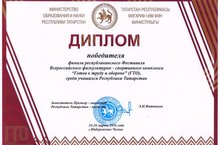 Поздравляем Мифтахутдинову Аделину, ученицу 11б класса, с победой в финале республиканского фестиваля Всероссийского физкультурно-спортивного комплекса «Готов к труду и обороне» (ГТО), среди учащихся Республики Татарстан. Учитель: Мачтакова Наталья Ивановна.