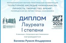 Ученица 11Б класса Валиева Рузиля стала лауреатом 1 степени муниципальной научно-практической конференции «Культурное наследие Нижнекамска - личность, творчество, время», посвященной 60-летию города Нижнекамск». Ее исследовательская работа построена на стихотворениях местных авторов о родном городе и единогласно всем составом жюри была признана самой лучшей! Учитель Хафизова Гульназ Райхатовна. Дальнейших успехов Рузиле и креативных идей руководителю!